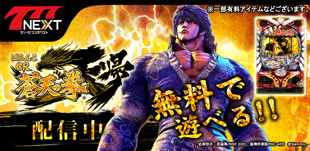 「ぱちんこCR蒼天の拳天帰」(サミー株式会社)がスマホ向け無料パチンコ・パチスロゲーム「777NEXT」に登場!