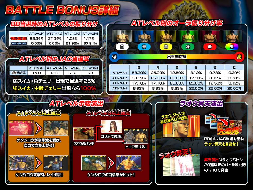 バトルボーナス入賞時にオーラの色で1~4のATレベルを示唆。