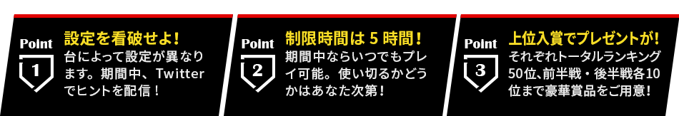 ・前半戦、後半戦それぞれ、スタート時の持ち玉はパチンコ「12,500発」、パチスロ「2,500枚」です。持ち玉がなくなるとそこで終了です。